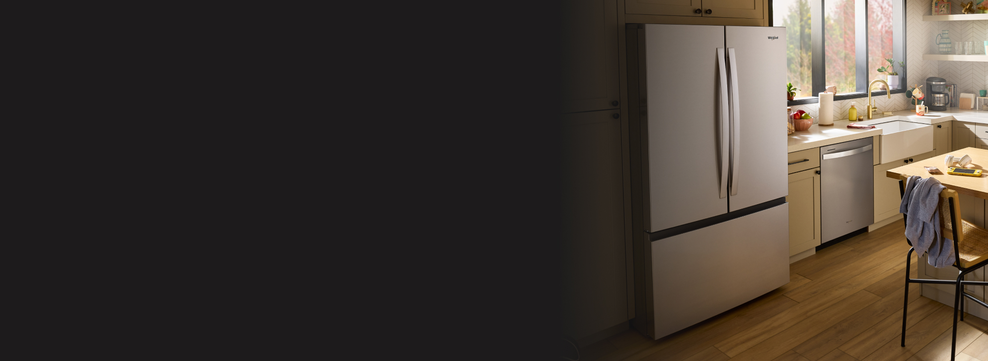 Les réfrigérateurs à portes françaises disposent d'un espace de réfrigération continu avec deux portes au-dessus d'un tiroir de congélation. Cette configuration, notamment ces réfrigérateurs à portes françaises KitchenAid®, est de style garde-manger.