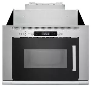 Another space-saving strategy for a small kitchen design is to buy multi-purpose appliances such as a microwave that also act as a range hood. An over-the-range microwave also makes it easy to transfer items from the microwave to the cooktop.