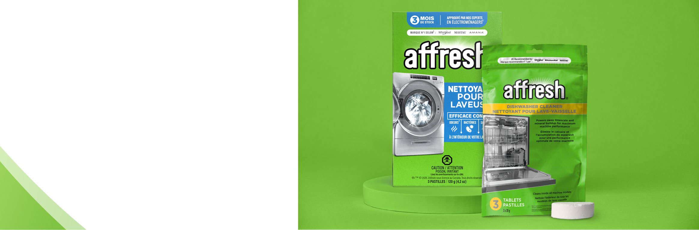 1. Tous les produits de marque affresh® et tous les produits des marques qui la recommandent sont la propriété de Whirlpool Corporation et sont distribués par celle-ci.