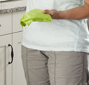Pour éliminer les dépôts d'aliments et d'eau sur une surface en acier inoxydable, utilisez un chiffon en microfibres propre, humidifié à l'eau chaude. N'oubliez pas d'essuyer dans le sens du grain pour éliminer les taches ou la saleté collée.