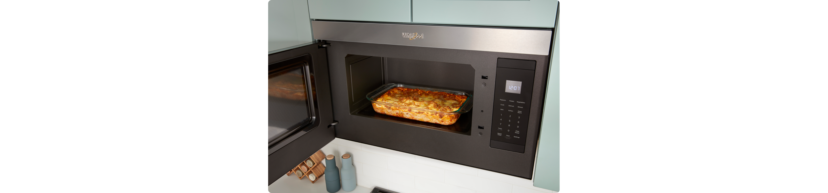 Faites tenir les verres hauts, les assiettes larges et même les plats de 13 x 9 po dans ce four à micro-ondes à profil bas avec capacité essentielle.