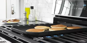 Cuisinière au gaz à four double avec brûleur ovale central - 6 pi cuServez le souper rapidement grâce à cette cuisinière au gaz à four double. La cuisson par convection véritable vous permet de faire cuire les aliments plus rapidement. Par ailleurs, la conversion pour la cuisson par convection fait le calcul pour vous en réglant le temps et la température de cuisson. La technologie Frozen Bake™ vous permet de sauter l'étape du préchauffage de ce four pour les mets congelés comme la pizza, la lasagne, les croquettes de poulet, les frites ou les tartes. Les grandes plaques chauffantes et d'autres plats de cuisson plus longs chauffent de façon uniforme sur la cuisinière grâce au brûleur ovale central. Et si vous faites des dégâts, les grilles en fonte à charnières EZ-2-Lift™ offrent un accès rapide pour essuyer les liquides renversés sur la table de cuisson de la cuisinière.