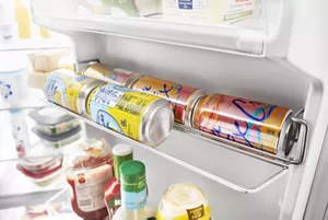 Libérez de l’espace sur les tablettes pour une plus grande flexibilité grâce à ce support à canettes dans la porte, qui peut accueillir des canettes ou des bouteilles.